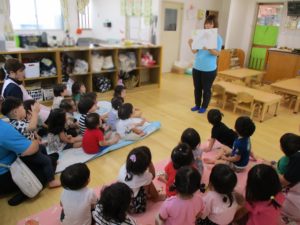 「へいわってどんなこと?」アンパンマンとバイキンマンが出てくる紙芝居を見たり、保育士の劇を見たりして