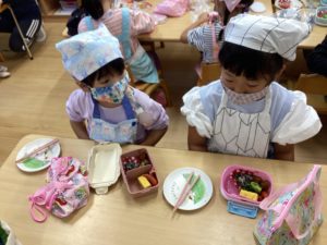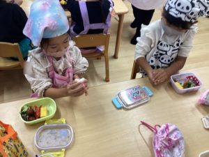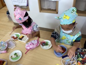 今月はお弁当作りをしました。お皿に乗っている一人ひとりのおかずを自分のお弁当箱の