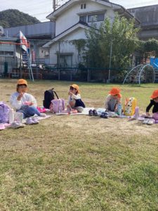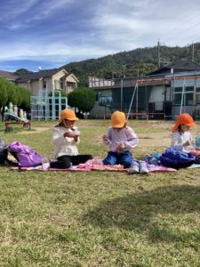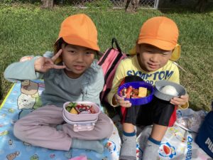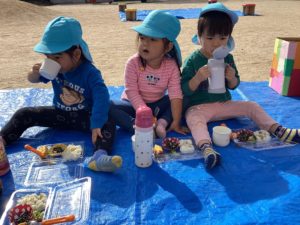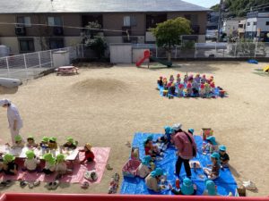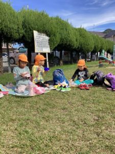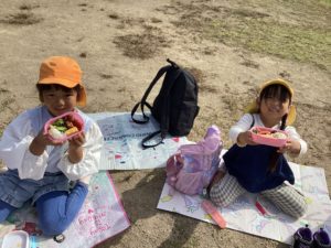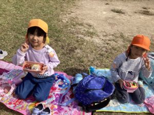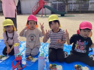 今日は、さくら組、れんげ組、だりあ組、ゆり組もお外でお弁当給食でした🎵