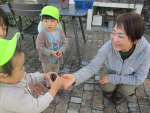 帰り道、ますます屋さんが「可愛いね。まつぼっくりをあげるよ」と優しく声をかけて下さり、一つずつまつぼっくりを下さいました😊