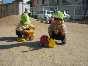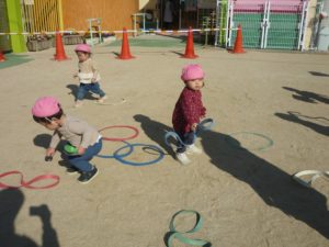 砂場・すべり台・ネコバス・フープジャンプ・車の玩具など好きな所へ行って、