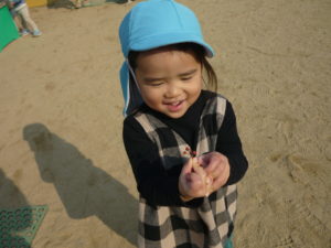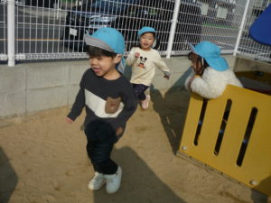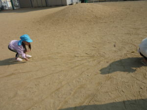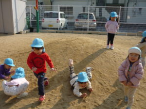 昨日の続きをするかのように、コロコロと転がったり、ほふく前進のようにして砂山を降りたりと、服が砂だらけになりながらも全身を使って伸び伸びと遊んでいました🌼