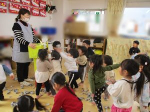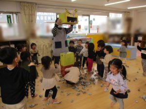 新聞紙の豆を力強く投げていた子ども達でした😄