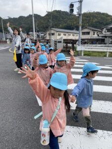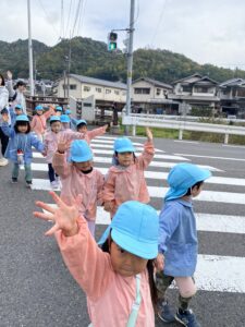 出かける前のお約束、✋友だちと手を繋ぐ、⚠道路に飛び出さない、💡人に出会ったら挨拶をする、などなどみんなで約束を確認して、いざ出発!!