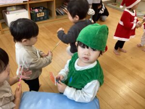 「赤鼻のトナカイ」や「あわてんぼうのサンタクロース」の曲に合わせて鈴を鳴らしたり、