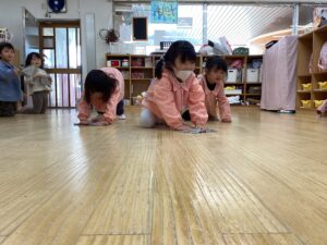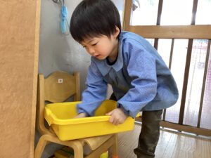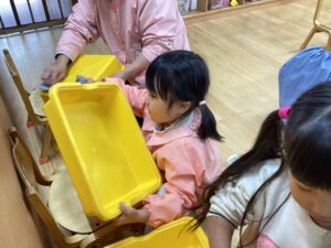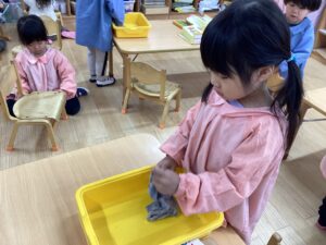 「なんかクレヨンが付いてる😲」「すごいきれいになったよ!」と、しっかりと汚れを拭きとってから道具を整理して入れました。
