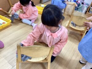 椅子の足や裏もしっかり拭きます✨真剣な表情で一生懸命拭いていますね😊