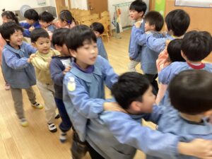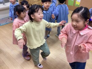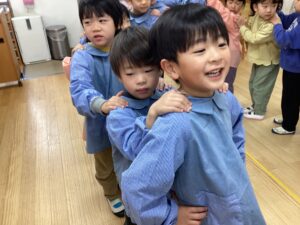 他のクラスのお友だちとじゃんけんをしたり、列車になったりして楽しそうな子どもたち💓