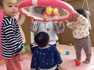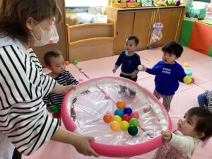 プールスティックにビニールを張った物に、ボールを集めて皆で協力して運んだり、下から覗いたり、弾き飛ばしたりと色々な遊びを楽しみました😊