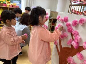 みんなで力を合わせて桃の木が満開になりました。