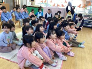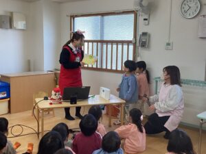 ネコさんみたいに丸まった姿勢になっていないかな?背筋を伸ばしてピシッと座ろうね。とお話を聞き、さっそく背中をピン!と伸ばして座る姿も見られましたよ👏