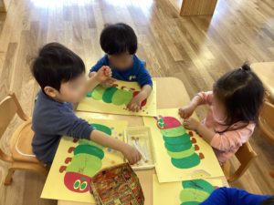 「はらぺこあおむし作る―」「おめめはここ?」「見てー」と楽しそうに活動に取り組んでいました。