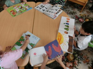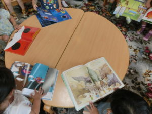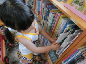 何度か『こども図書館』を利用しているので、元あった場所に返したり、背表紙が見えるように返したり、一人ひとりが意識して丁寧に絵本を扱えるようになってきています。