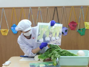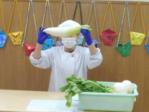 「葉っぱが付いていると、葉っぱに栄養がいってしまい、大根の元気がなくなっちゃうんだよ」と話しました。