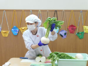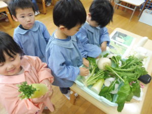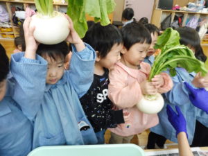 カブは畑ではこんな姿だよと見せると、「見たことあるー!」とお野菜に詳しいきりん組さんでした。
