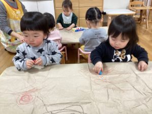 広い模造紙いっぱいにクレヨンでなぐり描きをしました。クレヨン箱の中から好きな色を選び、自由に描いてみましたよ。横にクレヨンをすべらしたり、ぐるぐると描いてみたり、点々と音を楽しんだりしてクレヨンを楽しみました。優しく線を描く子もいれば、二刀流でクレヨンを持ち豪快に描く子もいてそれぞれに楽しんでいました♪