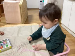 「そろそろ、おしまいね」と言うと、まだ遊びたくてクレヨンを離さない様子も。少しずつ自我も出始めてきた証拠ですね。またしようね♪