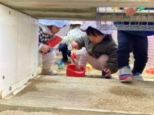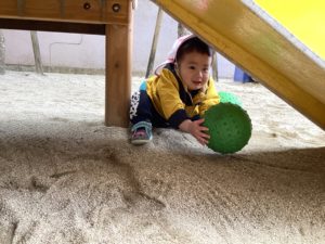 どんぐり広場では、ボール遊びや人気な砂場遊びでよく遊んでいます。ボールを転がしたり投げたり蹴ったりと楽しんでいます。ボールを投げて頭に当たってもへっちゃらで笑っているくらいですね♪転がっていくボールを追いかけて、遊具の下まで入ってボールを見つけていました!頭を打たないように低い姿勢で取る姿も見られました。体を使って伸び伸びと遊んでいます。
