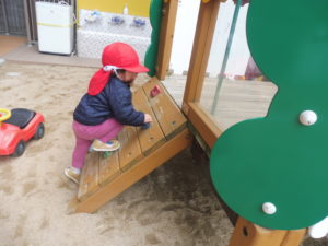 こちらは大型遊具です。階段を上がるのもお手の物!保育士ももちろん側についていますが、もう手を借りなくてもへっちゃらといわんばかりにスイスイ上がれるようになりました。別の面に設置されているミニロッククライミングでも、どこに手や足を掛ければ上に行けるのか子どもたちなりに考えながら挑戦している姿が増えてきました。