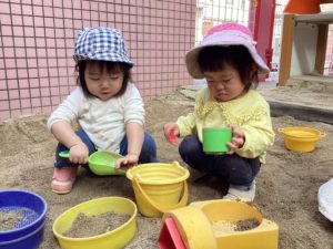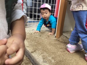 はじめの頃は、まだ歩けない子どもたちは、テラスで外気浴や玩具で遊んでいましたが、みんなが遊ぶ方へ行きたくてハイハイで砂の上を探索活動するようになり、今では、みんなが靴を履いて遊べるようになってきました。どんぐり広場で遊び慣れた子どもたちは日々新たな発見を見つけて楽しんでいます。