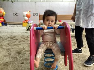 広い場所で自由に走ったり、ゴムチップの感触、外の景色を見て楽しんでいます。そしてコンビカーに乗ったりしゃぼん玉を追いかけたりと伸び伸びと体を動かして遊び、とても楽しそうな子どもたちです♪これからもっと寒くなっていきますが、ぽかぽかとしたお日様が出た時は、戸外でたくさん遊びたいと思います。