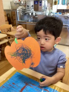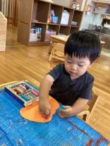 まずはかぼちゃ型の台紙を好きな色でぬりぬり・・・しっかりと握って描いていました。