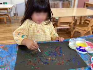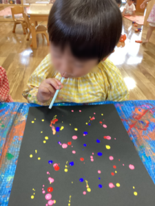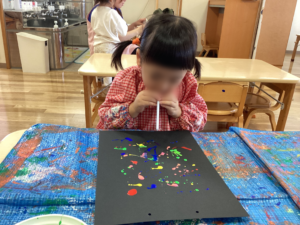 8月の製作で絵の具を使い、ストローで息を吹きかけてみたり絵の具をなぞってみたりして色を混ぜて模様を作りました!