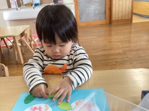 小さな手で、上手にのりを付けて貼ることもできています!