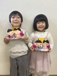 おだいりさまとおひなさまの顔を描いたり柄入りの折り紙を貼って素敵な着物作りをしていった子どもたち。