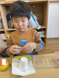 好きな柄の折り紙を自分で選んで丁寧に貼ったり、斜めに貼ったり、まっすぐ貼ったり・・・