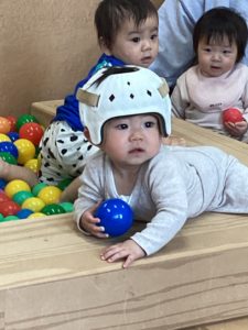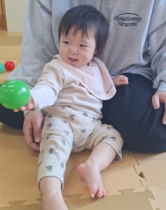 「ほ~ら見てごらん!ボールだよ!」と先生がボールをちょんちょんとタッチ。
