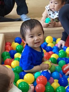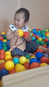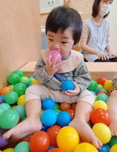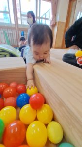 初めての「ボールプール」では、たくさんのカラフルなカラーボールに囲まれて、最初はポカーン…。