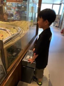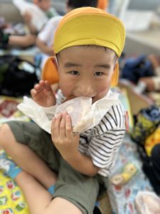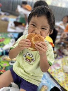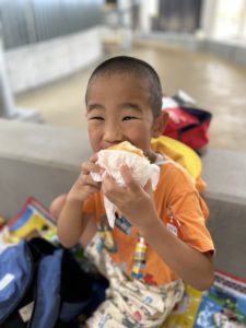 たくさん遊んでお腹ペコペコの子どもたちは、なんとスタッフさんのご厚意でEDION PEACE WINGで給食弁当を食べさせていただくことに…!