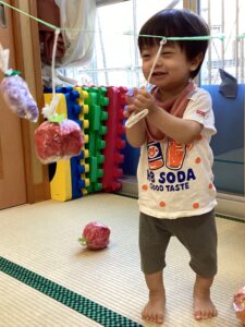 ひもにぶらさがったりんごやかき、ぶどうを見つけて…
