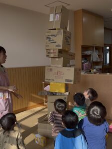 一人が積み上げ始めると、僕も私も…と、どんどんどんどん運び、高~い段ボールタワーに☆