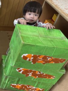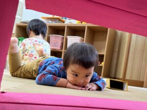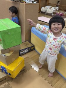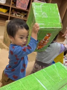 段ボールワールドに大変身した保育室で、一人ひとり思い思いに全身で楽しむ子どもたち!