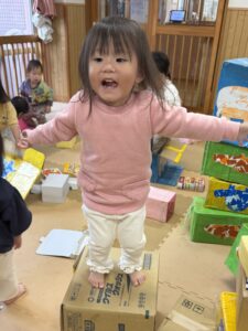 段ボールの上から「えいっ!」と思いっきり飛び降りて大はしゃぎしたり、バンバン叩いて「ドンドコドンドコ♪」一人ひとり夢中になってリズミカルに叩いたり…。