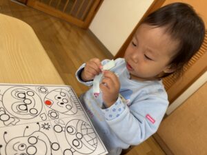その自由さが1歳児らしくてとってもかわいかったのですが、ちょっとだけレベルアップして「丸の枠の中に貼る」という、小さな挑戦を!!