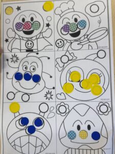 今までは、思うままにペタペタ貼るのが楽しくて、紙いっぱいに貼ったり、机の上にまで貼ったり、気付けばほっぺに貼っている子も…。