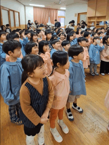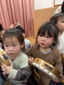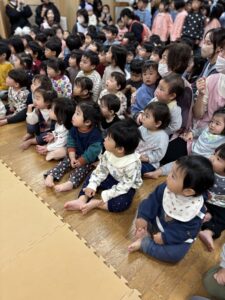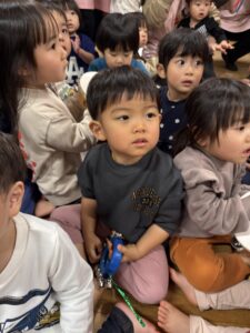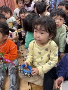 乳児クラスの子どもたちの鈴やタンバリンの音と幼児クラスの歌声とダンスが重なって、一気にクリスマス気分が高まりました☆