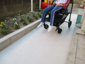 スロープができた事で、利用児にとっても、支援者にとっても、ステキな場所になっています。出入りがしやすくなったことや、少し立ち止まって、秋の風を感じたり、花壇の花を見て「これ何の花?」「これはビオラだよ。きれいだね」など自然環境に触れ、一息つく場所になりました。色々な気持ちを感じながら、レインボーのスロープを通っています。