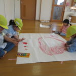 大きい紙を用意すると、友だちとお題を決め共同製作が始まりました。お弁当の中身を描き、友だちと「いただきます!!」と