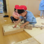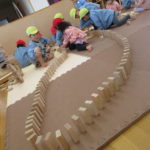 積み木コーナーでは、昨日年長組さんがやっていたドミノを思い出し、ばら組、ひまわり組で協力して作り上げる姿が見られました。