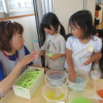 好きな色の絵の具を混ぜて、自分好みのスライムを見て大喜びの子どもたち😊