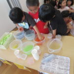 好きな色の絵の具を混ぜて、自分好みのスライムを見て大喜びの子どもたち😊