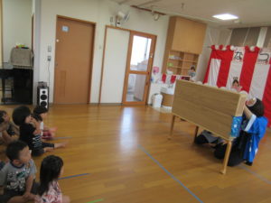 2,3歳児がホールに集まると、まずは『たなばた会』🎋からスタート!保育教諭のするペープサートで由来を知ったり、担任が、✨✨『子どもたちみんなが元気で過ごせますように…』✨✨という願いがこもった短冊を飾りました。