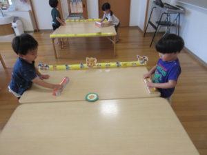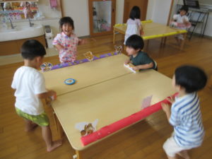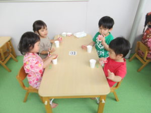 その後、昨日の『ゆりばらのつどい』で作った異年齢児のグループのみんなと 一緒に色々なコーナーを回りました。いっぱい一緒に遊ぶ中で、同じグループのみんなと手をつないだり、ゲームコーナーでは、順番を守ったり、交代を自然にしながら親睦をふかめたり、飲食コーナーでは、出来たてほやほやの『豆腐ドーナツ』をテラスで風鈴の音を聞きながら、テラスで心地よい心地良い風に吹かれながら『おいしいね~』と空を眺めながら、食べていましたよ!