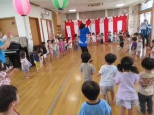 今日は待ちに待った夏祭りの日でした。日に日にクラスの壁面やテラスの前が夏祭りらしく装飾されてくると、「わあーちょうちんだ~」とか「私もお母さんたちとお祭りにいった事ある!など家族の思い出などを話してくれていました。