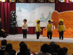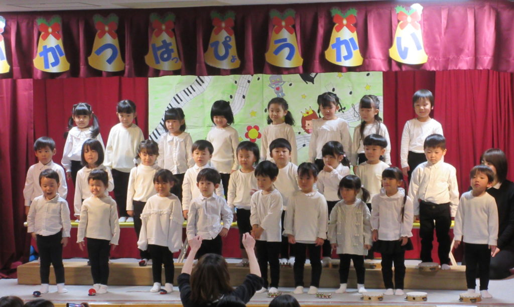 心を合わせて歌い、かわいい振り付けもとても素敵でした。楽器では、鈴、カスタネット、タンブリンでリズムに合わせて演奏することができました。子ども達が奏でる歌声と演奏がとてもすてきでした。