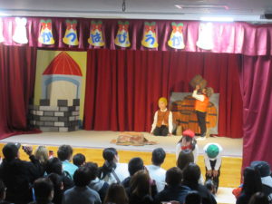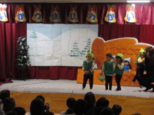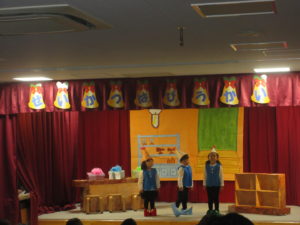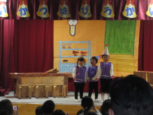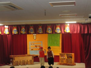 劇の中では、お店屋さんやこびと、お客さん、ナレーターなどを表現し、言葉のやりとりを楽しみました。長いセリフもしっかりと覚え、それぞれの役を演じました。